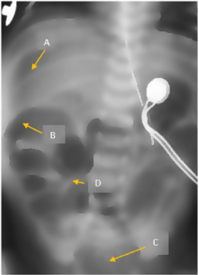 The abdominal x-ray below belongs to a premature neonate with a distended and firm abdomen as well as bilious emesis. Which marker indicates the patient has experienced intestinal perforation? Select the appropriate area.